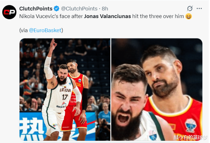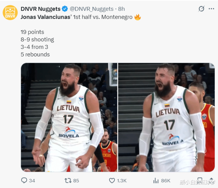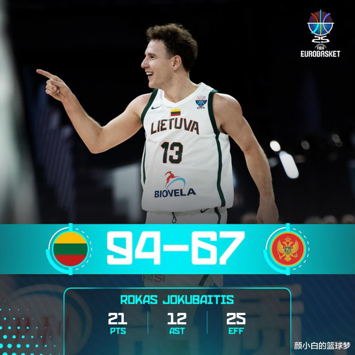 掘金媒体也晒出了瓦兰的怒吼瞬间来庆祝,此役立陶宛是4人上双,乔库巴蒂斯21分12助攻,布拉热维奇10分6篮板,威利奇才10分5助攻,全队12人都登场且全部得分。