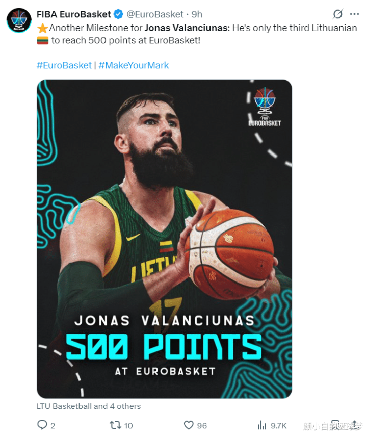 瓦兰作为立陶宛的核心,他已经成为立陶宛男篮队史第三位在欧洲杯上拿到至少500分的球员。