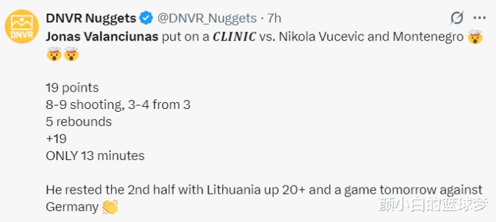 掘金媒体写道:瓦兰仅仅出战上半场13分钟就没有登场,立陶宛建立超过20分的优势可以让他安心休息备战德国男篮。